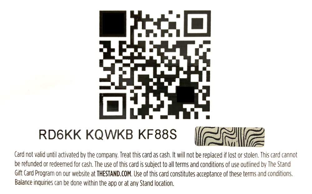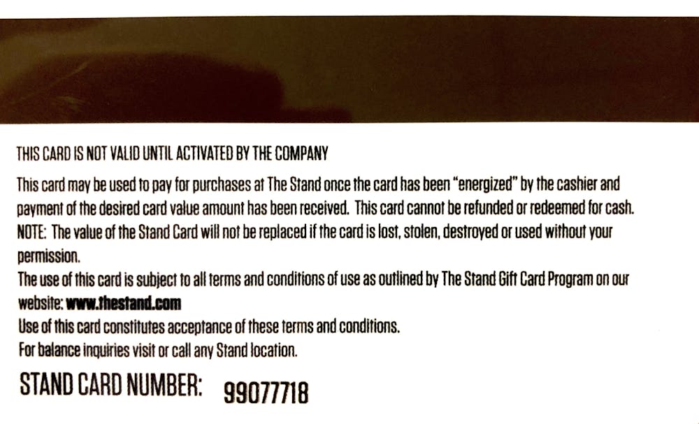 The original gift card may be used to pay for purchases at The Stand once the card has been energized by the company. This card cannot be refunded or redeemed for cash. Treat this card like cash. it will not be replaced if lost or stolen, destroyed or used without your permission.